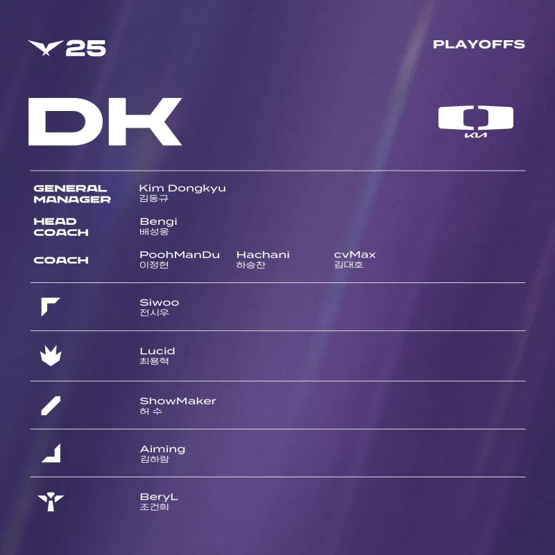 DK:Siwoo、Lucid、ShowMaker、Aiming、BeryL
